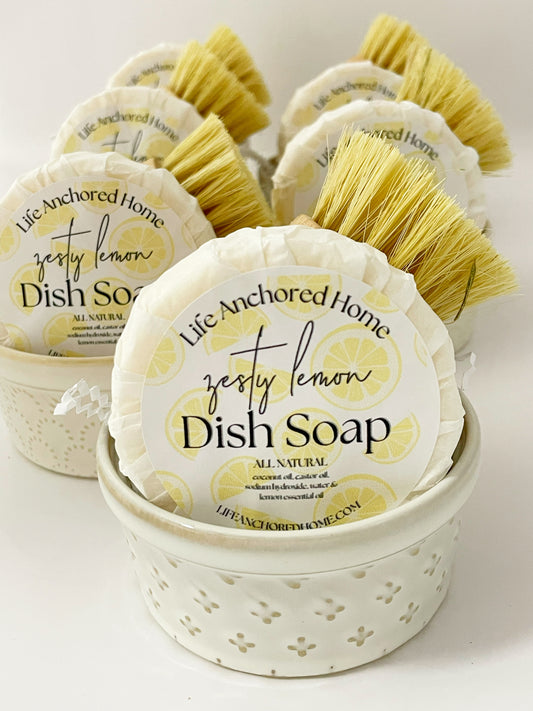 All-Natural Zesty Lemon Dish Soap Bar Set with Bristle Brush & Ceramic Soap Dish