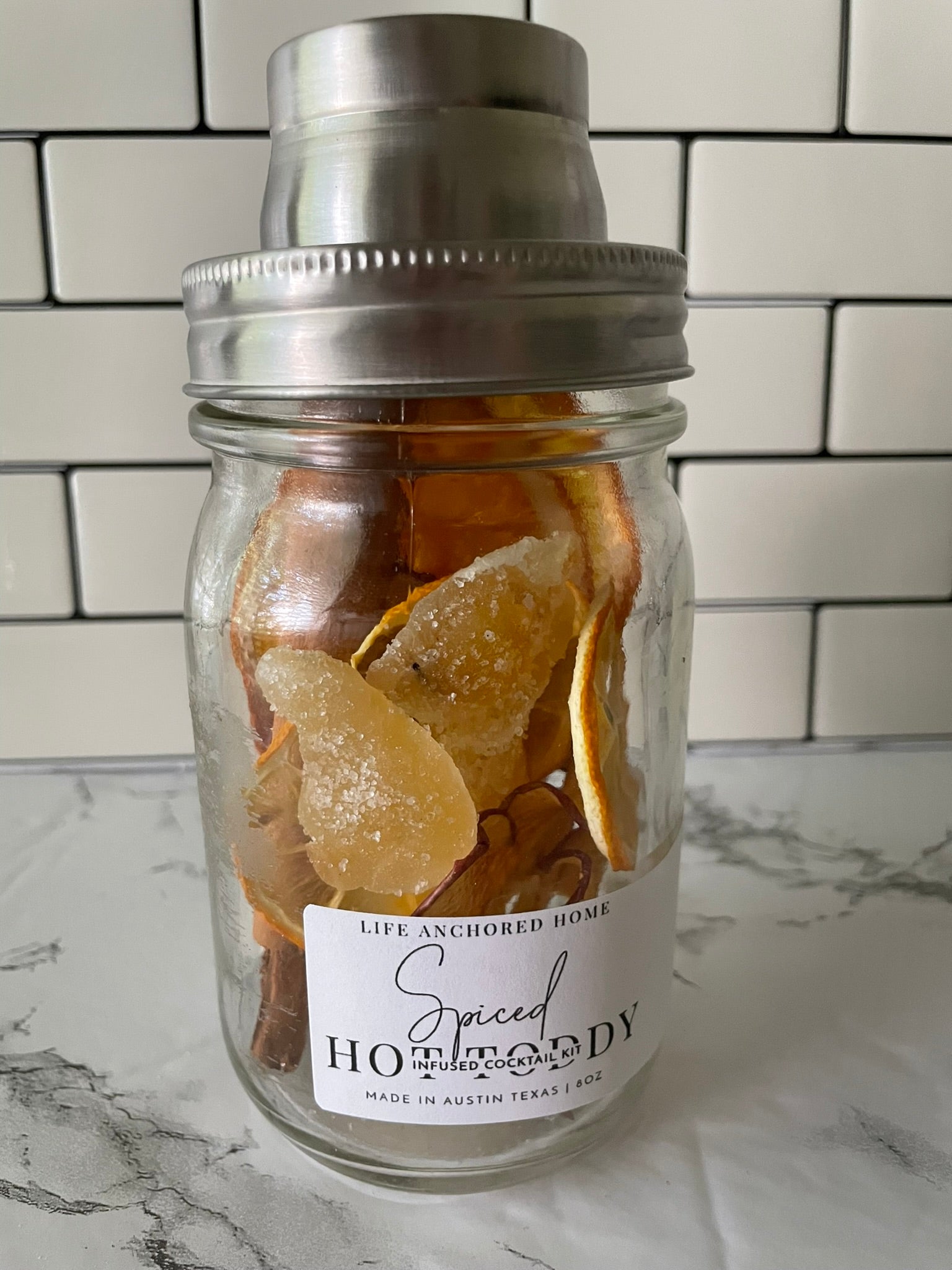 Introducing our Spicy Hot Toddy Cocktail Infusion Kit, a tantalizing blend of fresh lemons, oranges, apples, cinnamon, cloves, ginger and paired with our handcrafted lemon sugar. Packed in a convenient handled mason jar with a cocktail shaker lid, this kit offers an easy and elegant way to elevate your cocktail game.