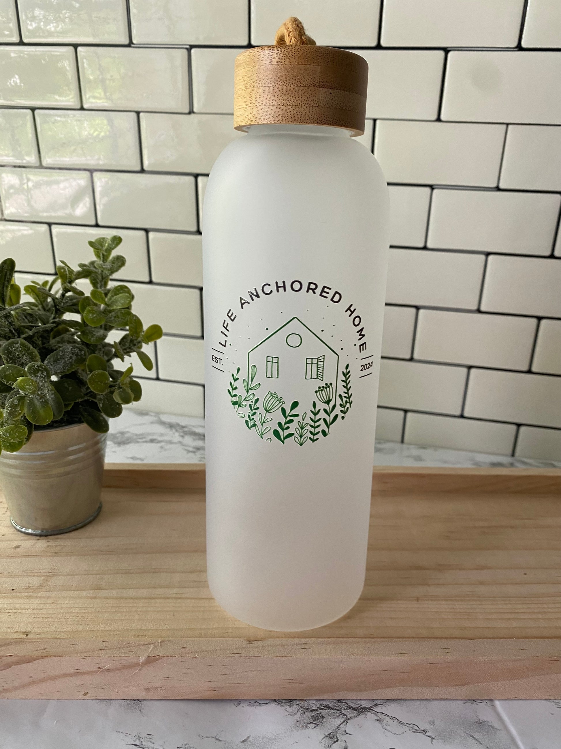 Introducing our Life Anchored Home Frosted Glass Water Bottle, a blend of elegance and sustainability. Crafted with durable frosted glass and topped with a chic bamboo lid, this bottle is a statement of style and environmental consciousness. Perfect for on-the-go hydration, its sleek design ensures you stay refreshed in style. Please note: Hand wash only to preserve its pristine condition. Embrace sustainability with every sip!