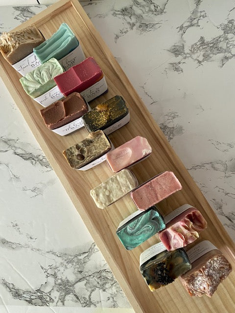 Each of our cold processed soaps are crafted with a mixture of Coconut Oil, Palm Oil, Canola Oil, Olive Oil, Sweet Almond Oil, Castor Oil, Vitamin E, distilled water, sodium hydroxide, natural colorants, tested fragrance oils and natural additives for decorative purposes.
