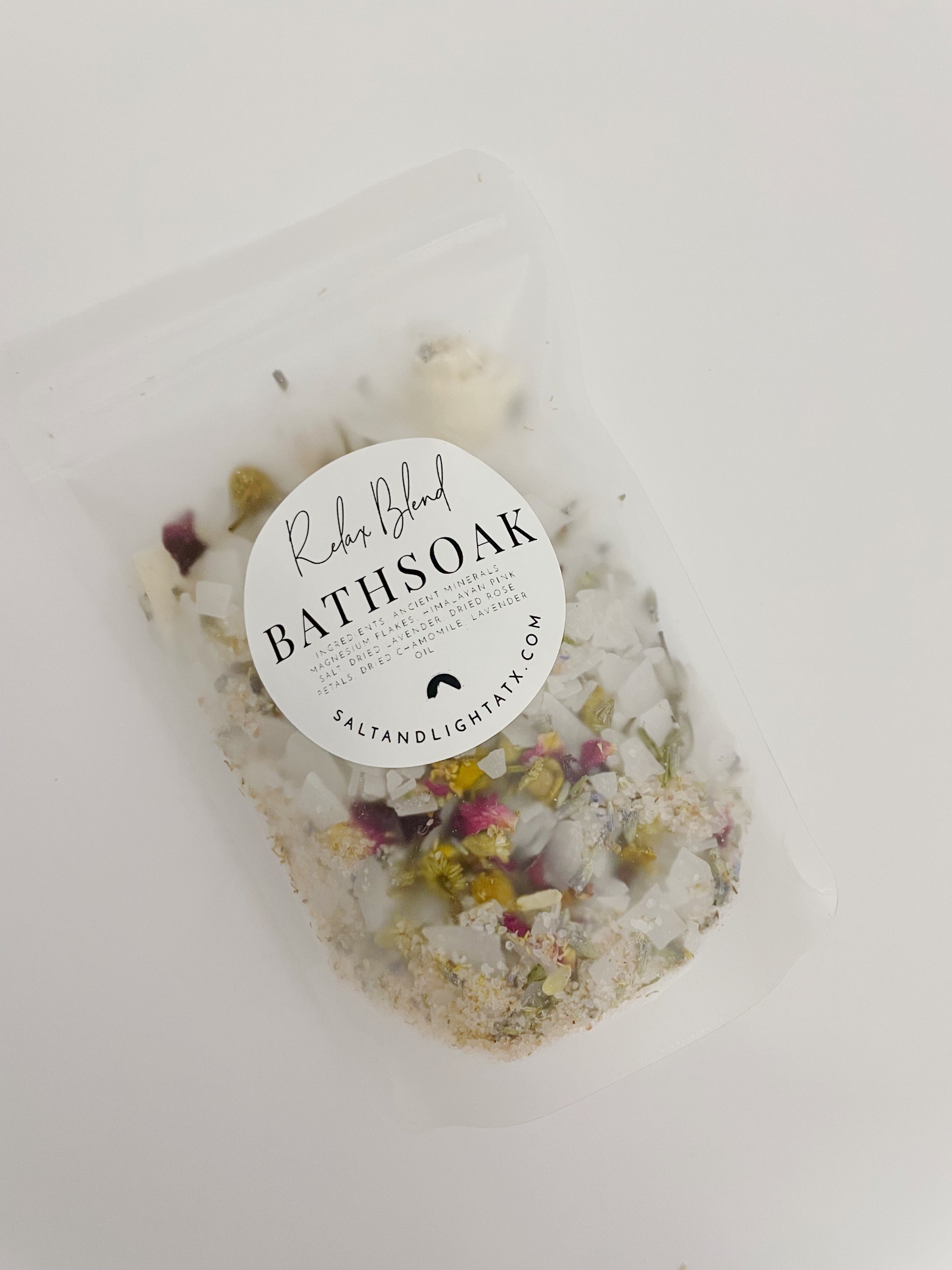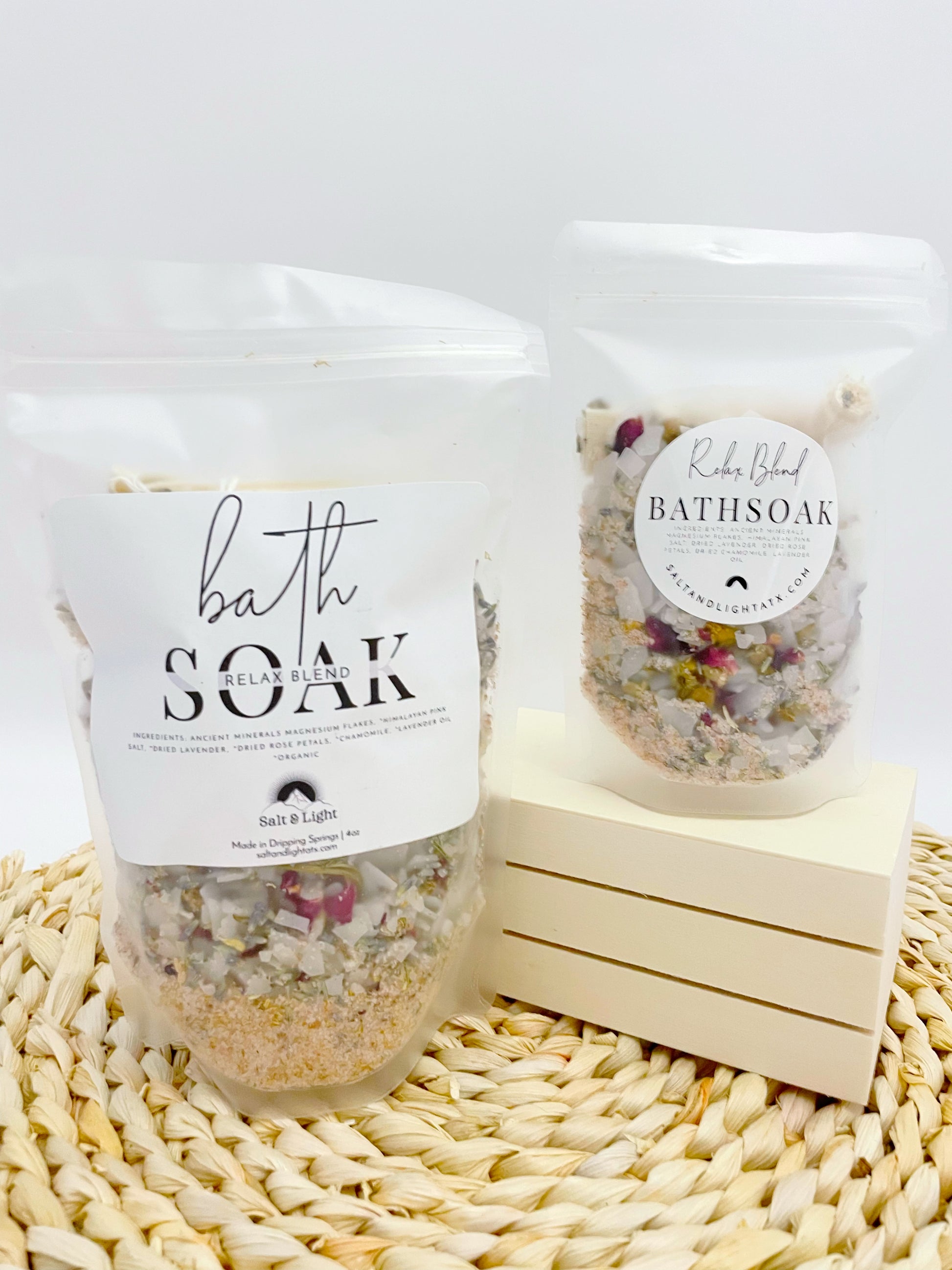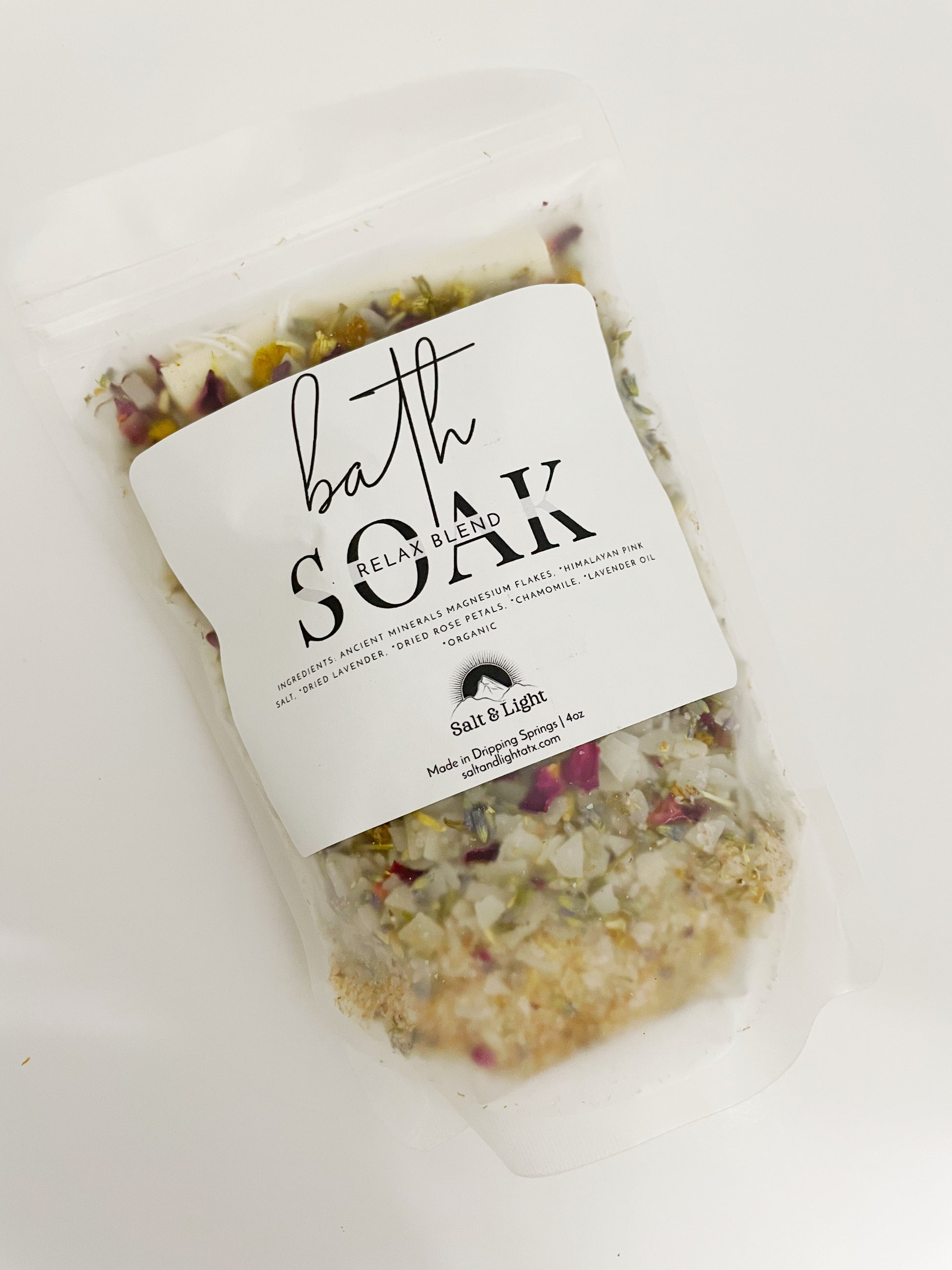 Soak in serenity with our Relax Blend Bath Salt Soak—a calming infusion of ancient minerals and organic botanicals crafted to restore both body and mind. Hand-blended in small batches in Dripping Springs, this luxurious soak features Ancient Minerals Magnesium Flakes and Himalayan Pink Salt to ease muscle tension and promote relaxation.