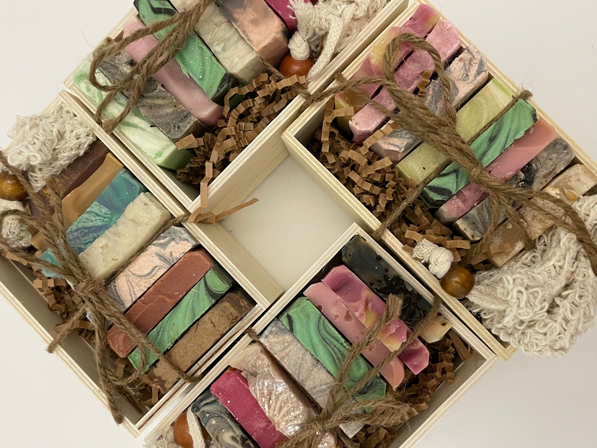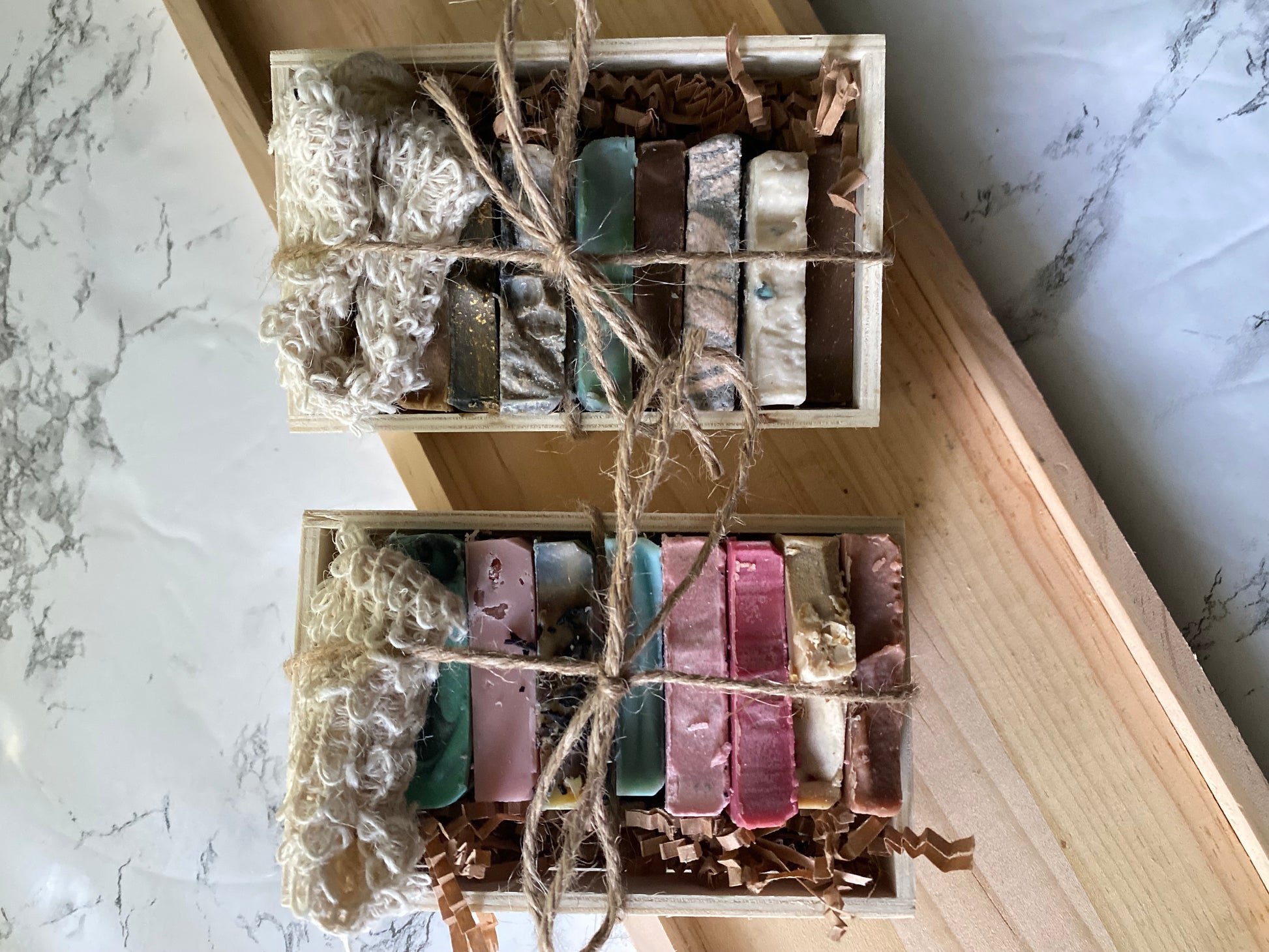 Our soap box sampler includes a mixed variety of 8 1/2 bars for your sampling. This is the equivalent of four full bars of soap, plus the bonus of our soap, saver bag, arranged in a simple wooden box. Perfect for gifting, or just trying a variety of different fragrances.